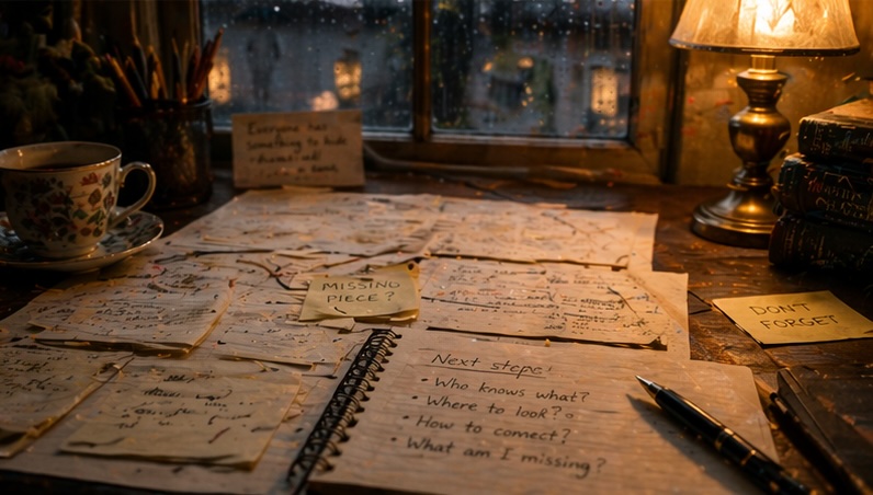 I started by creating mini-mysteries: smaller questions the detective must solve in order to uncover the full story. What does she need to find out? What should she deduce? I have a fairly good idea of what those pieces should be.